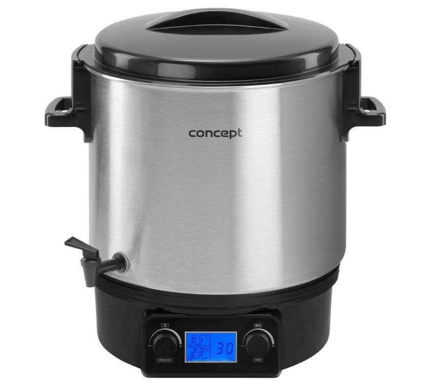 Zavařování potravin není žádnou novinkou. Tento osvědčený postup si nemohli vynachválit již naši předci. S moderním zavařovacím hrncem Concept ZH0040 bude příprava ovocných kompotů, marmelád, šťáv, džemů a dalších zavařenin hračka. Hodí se ale také na sterilizaci domácího moštu nebo na rozpouštění medu. Zapomeňte na pracnou přípravu a shon. Do hrnce o objemu 27 litrů se najednou vejde až 11ks 720 ml nebo 24 kusů 270 ml sklenic. Praktická funkce KEEP WARM udržuje konstantní teplotu po celou dobu procesu, časovač vám pomůže určit konec vaření a díky výpustnému kohoutku se snadno zbavíte přebytečné vody.