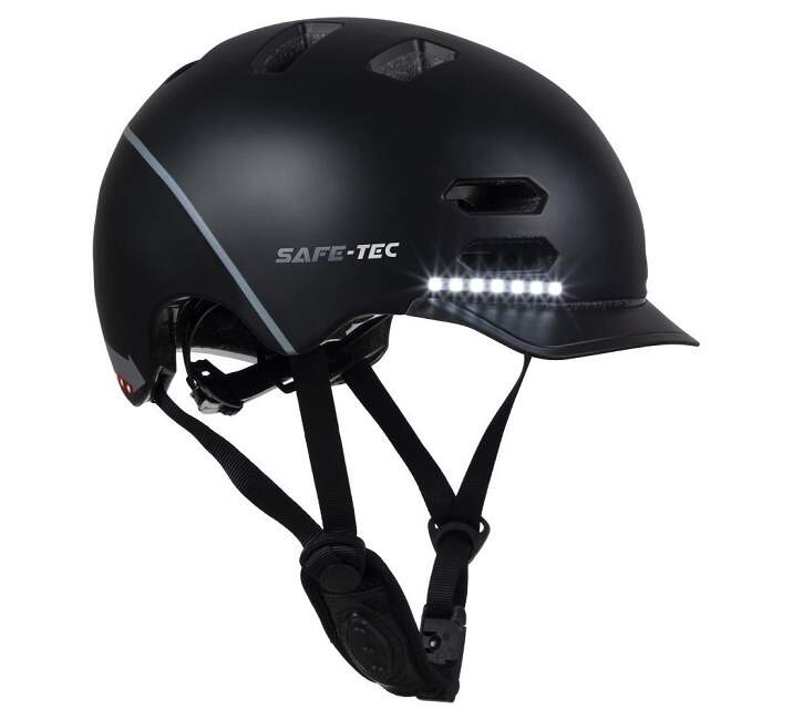 Aby byla městská mobilita bezpečná, nesmíme zapomenout na helmu. Naším tipem je Safe-Tec SK8 L, která parádně svítí, což se hodí po večerech, ale navíc je vybavena reproduktory, které nepřehlušují okolí a mikrofonem pro bezpečné vyřizování hovorů. Inteligentní helmu stačí jednoduše spárovat s mobilem pomocí technologie bluetooth.